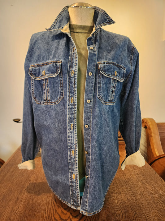 Hand-Printed Custom Denim Jacket/Shacket, North Style Ladies' SM, "Cravings" by artist Jernie Scott
