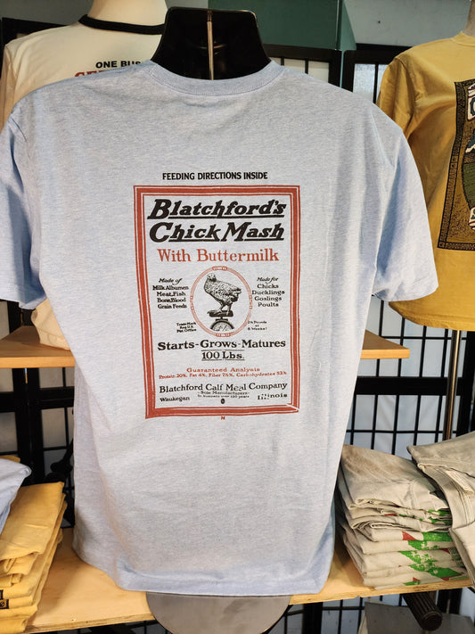 Vintage Seed Bag design; "Blatchford's Chick Mash" Waukegan, Illinois, Next-Level tee, Colombia Blue Heather