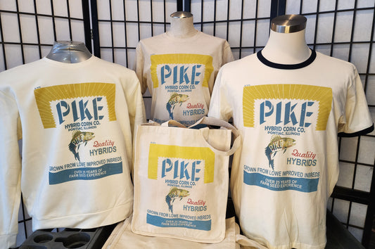 Pontiac, Illinois "Pike Hybrid Corn Co" vintage seed bag design, Next-Level tee, Natural Heather