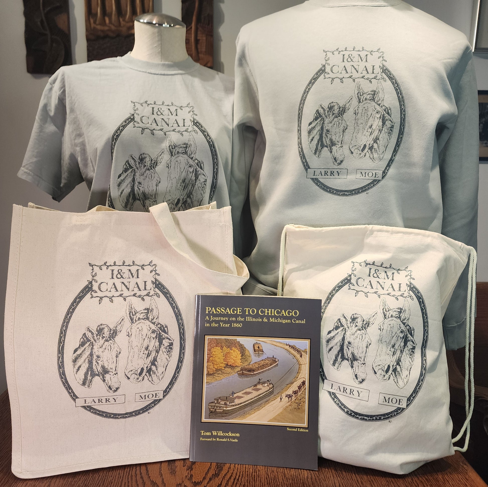 Featuring a beautiful pencil-drawn portrait of Larry and Moe, hand-printed onto a large cotton canvas drawstring backpack, natural in color.